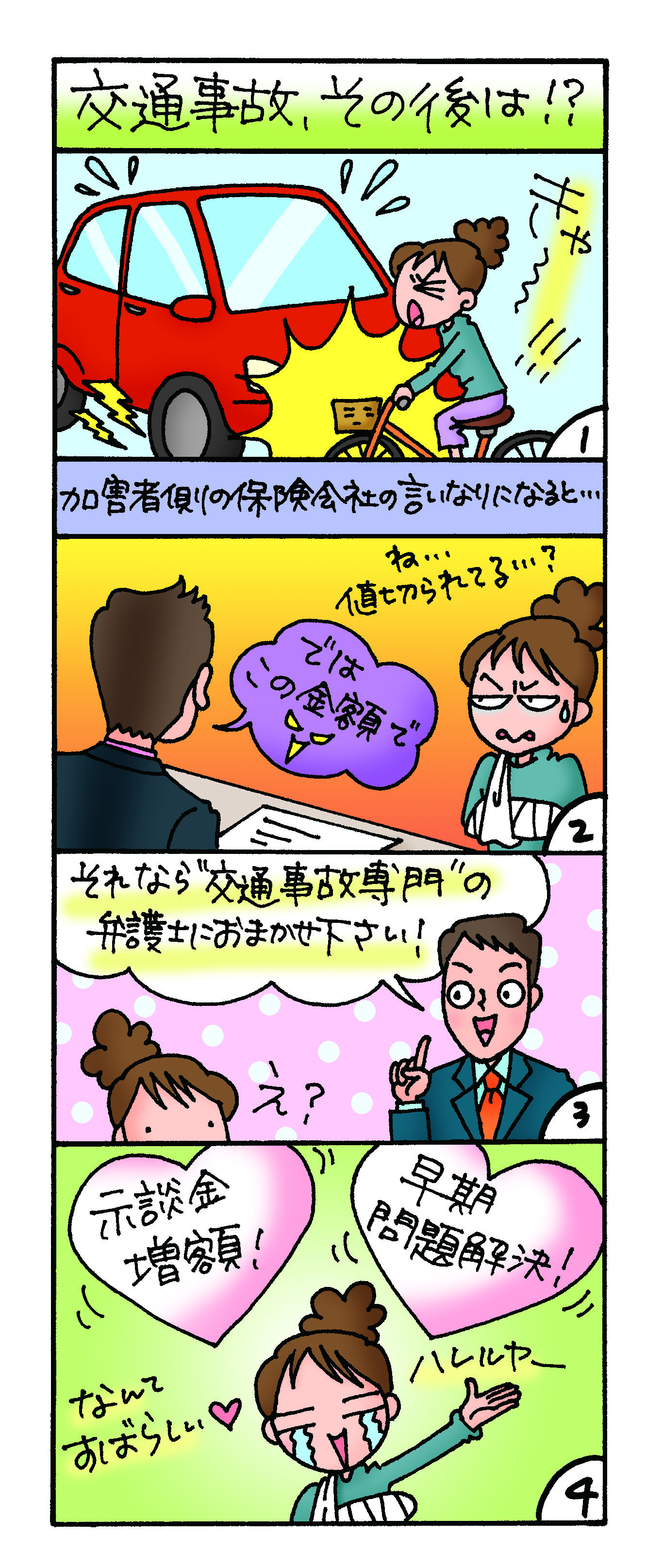 交通事故専門弁護士が介入することで示談金や慰謝料が増額できたり、自身での面倒な交渉も無く早く問題解決できるのです。
